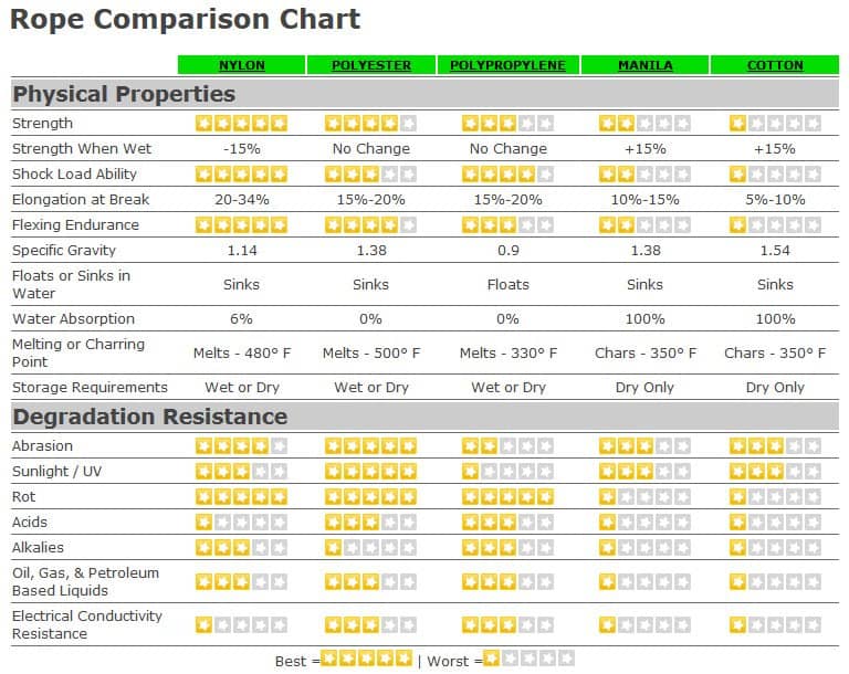 Die Auswahl der richtigen Schnur oder des richtigen Seils für Ihr Projekt kann überwältigend sein. Jeder Seiltyp hat seine eigenen starken und schwachen Eigenschaften. Einige Seiltypen haben eine große Bandbreite an Möglichkeiten, aber es gibt kein "one size fits all"-Seil. Um Ihnen bei der Auswahl des besten Seiles für Ihr Projekt zu helfen, können Sie diese Seilvergleichstabelle mit einer Übersicht über einige der gebräuchlichsten Seiltypen einschließlich ihrer Stärken und Schwächen verwenden.